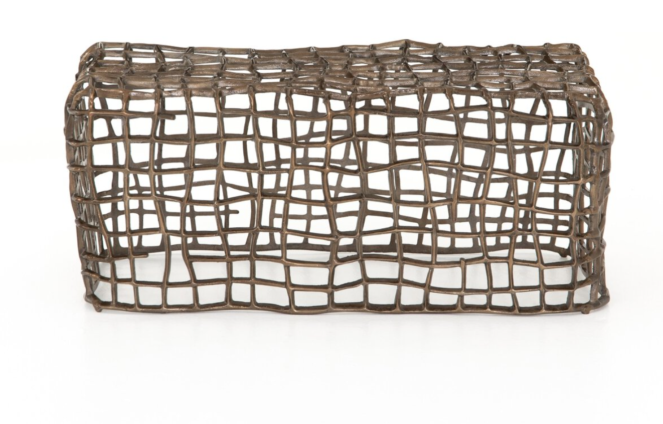 Aged bronze-finished aluminum forms a fluid, cage-like bench, for a forward-thinking look with clever distinction, indoors or out. Cover or store indoors during inclement weather and when not in use.