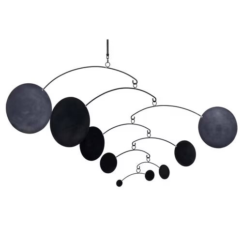 A kinetic sculpture constructed to take advantage of the principle of equilibrium The Mod Mobile is an ensemble of balanced parts that hang freely in space, by design without coming into contact with each other. Handmade in our Live from Detroit Workshop this process makes each piece subtly one-of-a-kind.