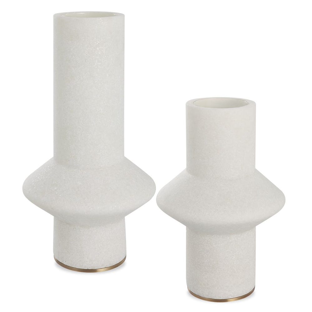The cool, space-age shapes of these vessels are giving us futuristic vibes. Created from ivory man-made stone, that accurately replicates the look of Thassos marble. The brass-finished base provides a light-reflecting detail. The varying vase heights create their own beautiful display or can be used to house floral stems.