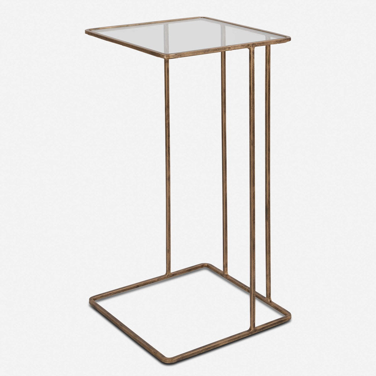 Minimally designed with versatility, this petite hand forged iron accent table is finished in heavily antiqued gold with a clear tempered glass top.