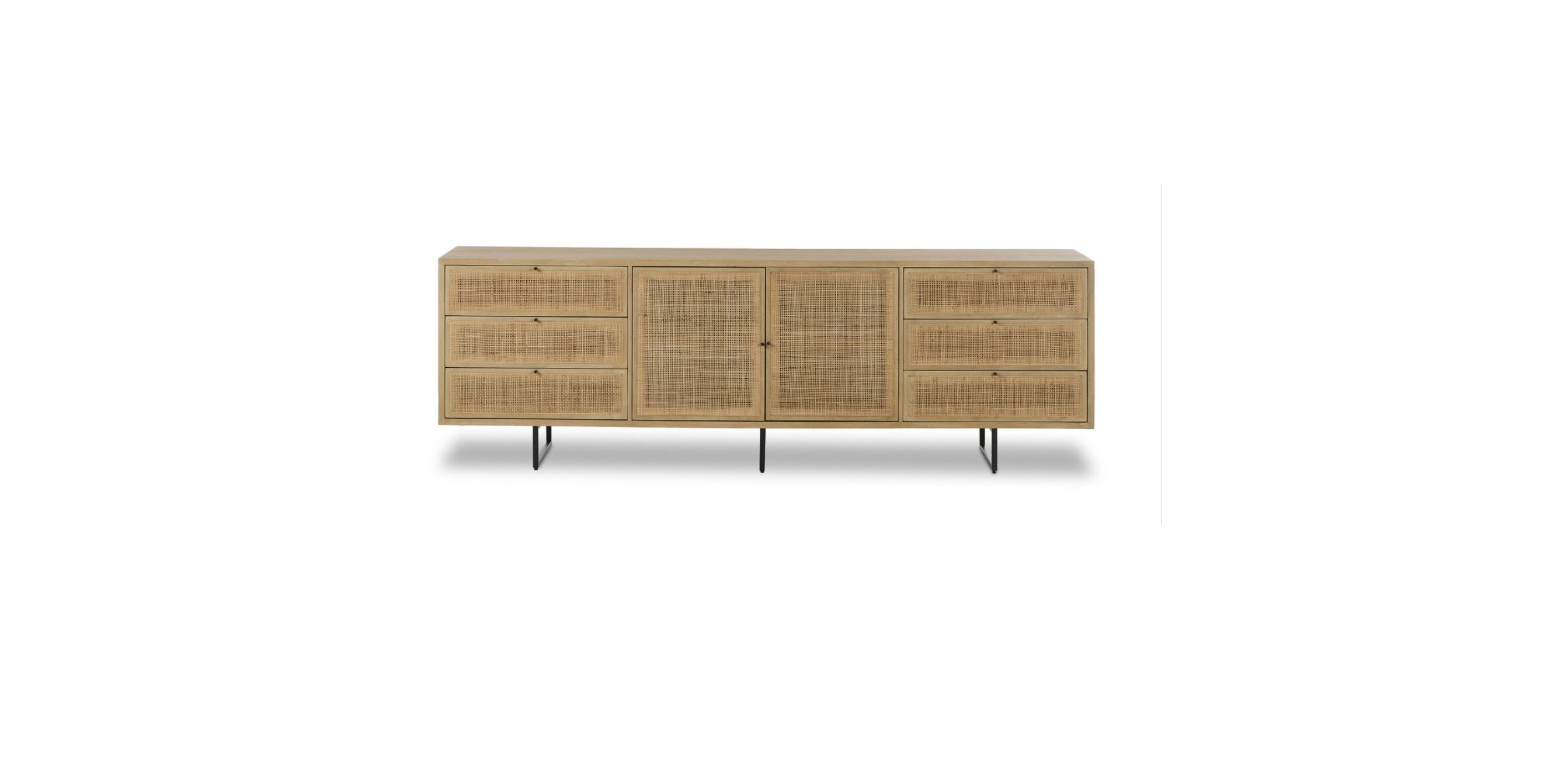 Midcentury-inspired style with an organic twist. Surrounded by mango casing, light cane weaves for a fresh, natural look. Finished off with angular gunmetal-finished iron legs.