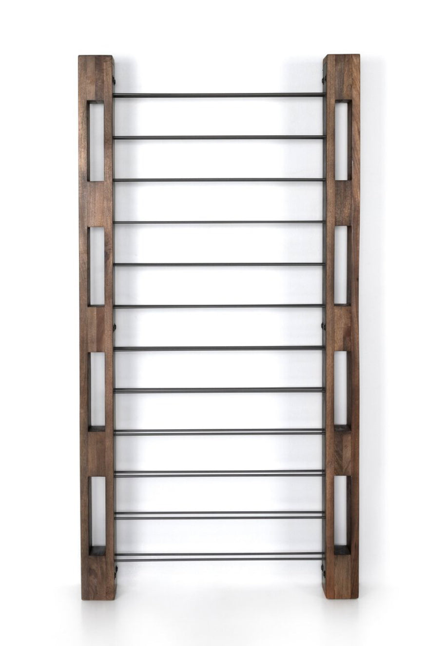 Solid smoked mango shapes a stately, wall-mountable wine rack, with gunmetal-finished iron piping ready to store up to 24 bottles of wine.