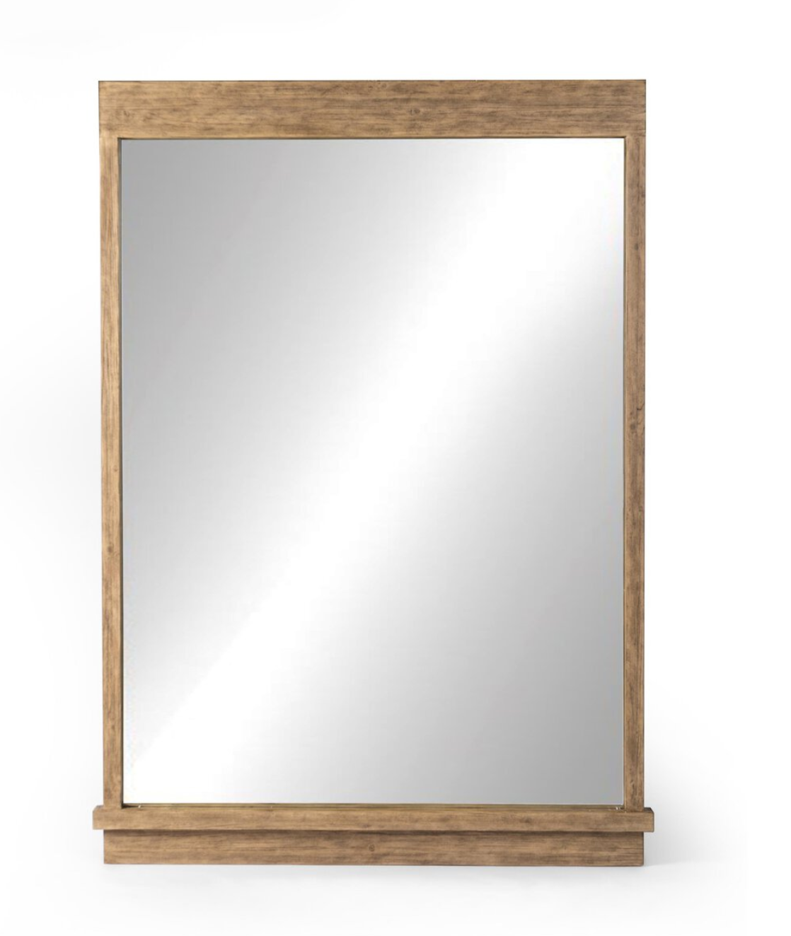Classic and clean, the wide-format mirror is constructed from light, distressed pine and uses different frame thicknesses on top and bottom for a vintage feel. A ledge detail runs along the base of the mirror, reflecting an illusion of a larger surface. Create an artistic vignette by using the shelf to display miniature vases or found objects.